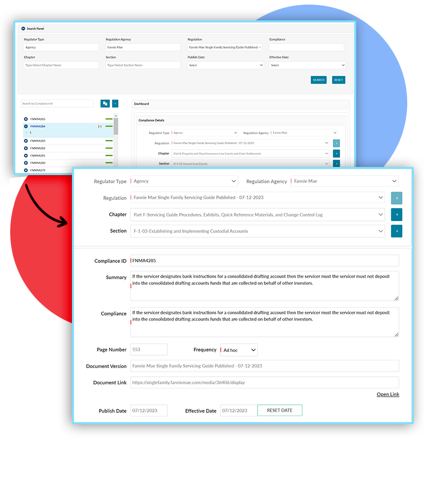 Veritiq ARC compliance framework interface showing configurable regulatory sections, chapters, and Fannie Mae servicing guide mapping